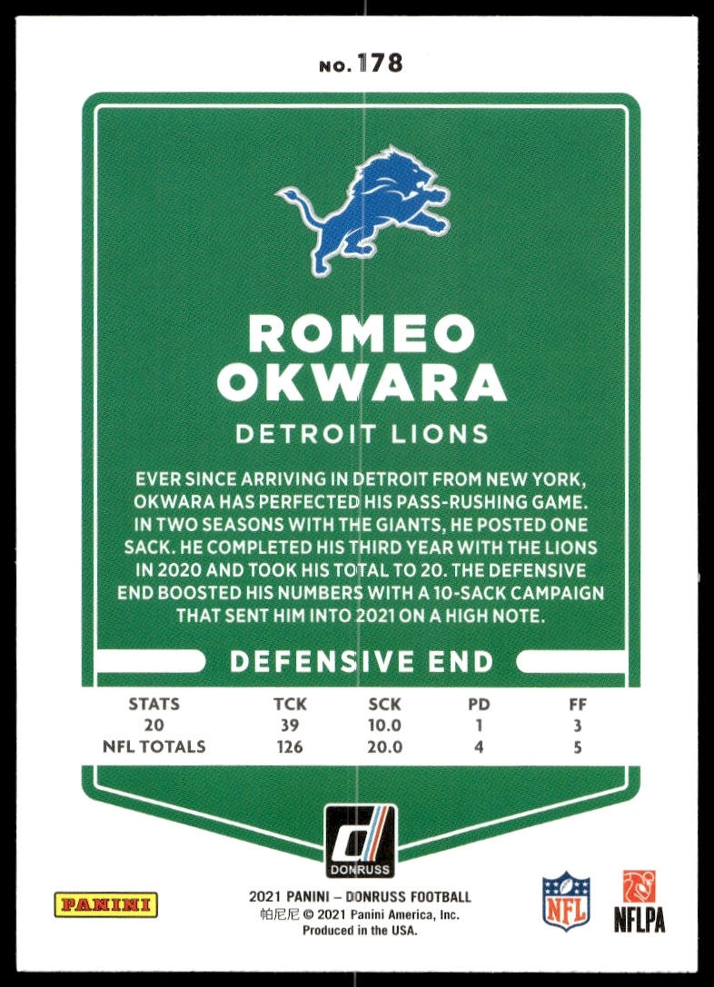 This Football card, from 2021 is part of the Donruss card set. Romeo Okwara is featured and has a card number of 178.