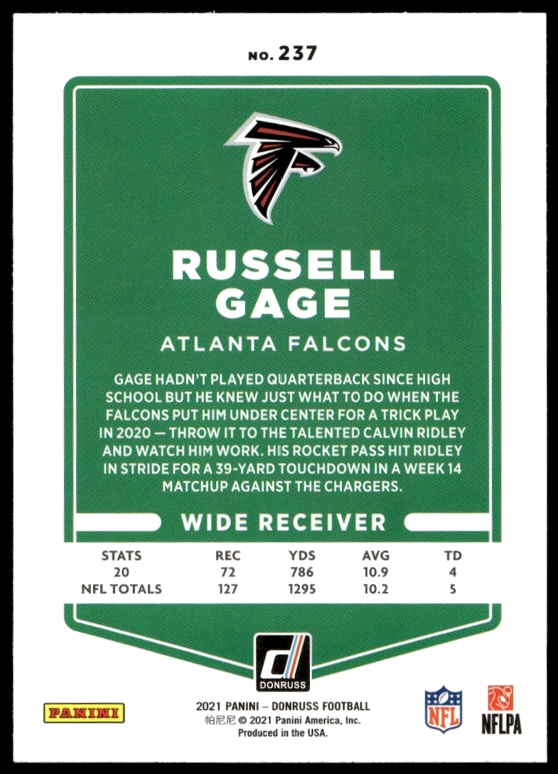 This Football card, from 2021 is part of the Donruss card set. Russell Gage is featured and has a card number of 237.