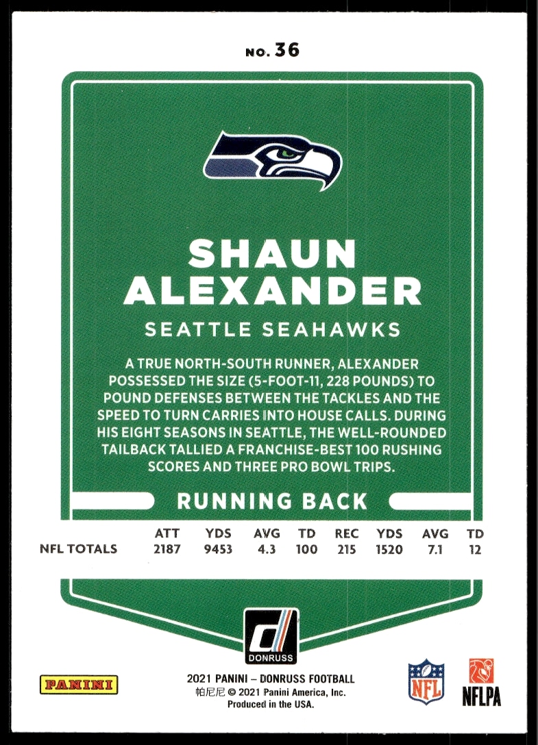 This Football card, from 2021 is part of the Donruss card set. Shaun Alexander is featured and has a card number of 36.