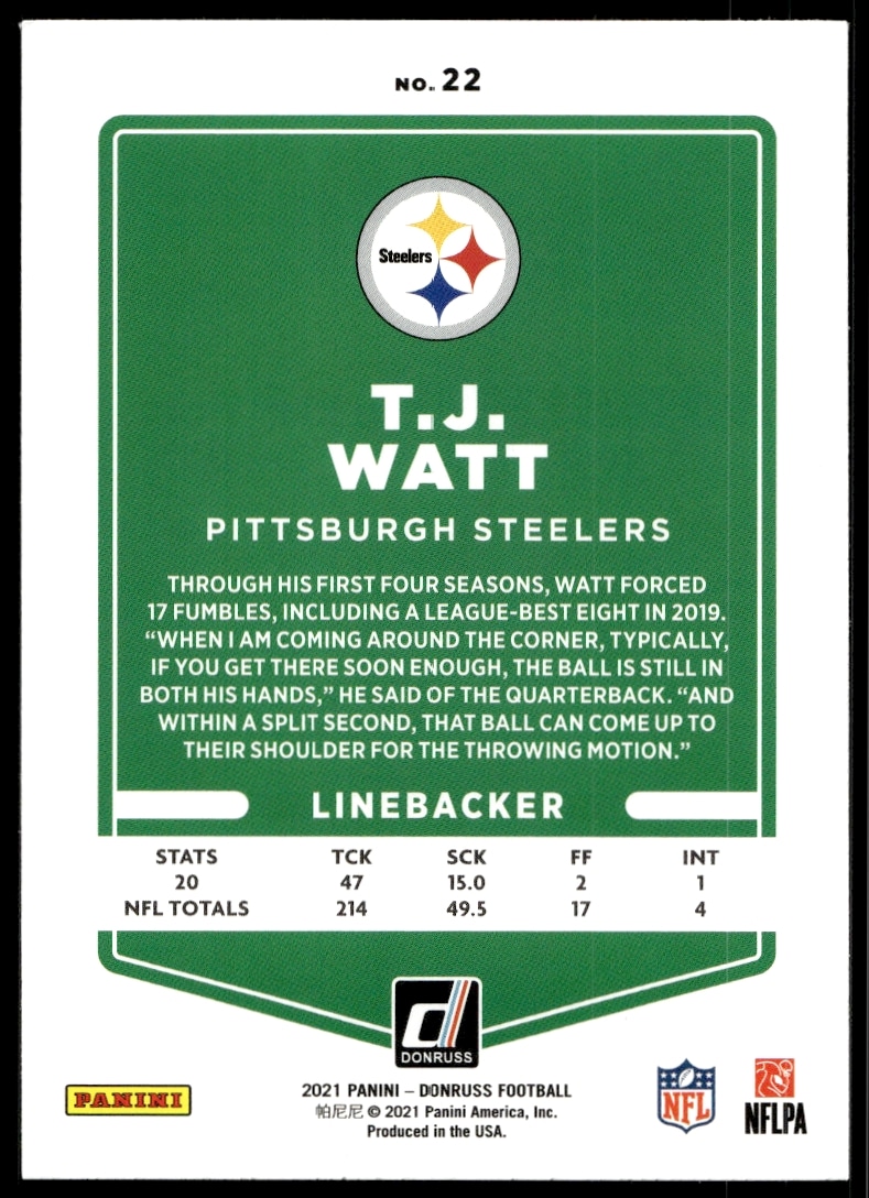 This Football card, from 2021 is part of the Donruss card set. T.J. Watt is featured and has a card number of 22.
