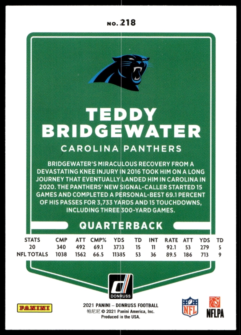 This Football card, from 2021 is part of the Donruss card set. Teddy Bridgewater is featured and has a card number of 218.