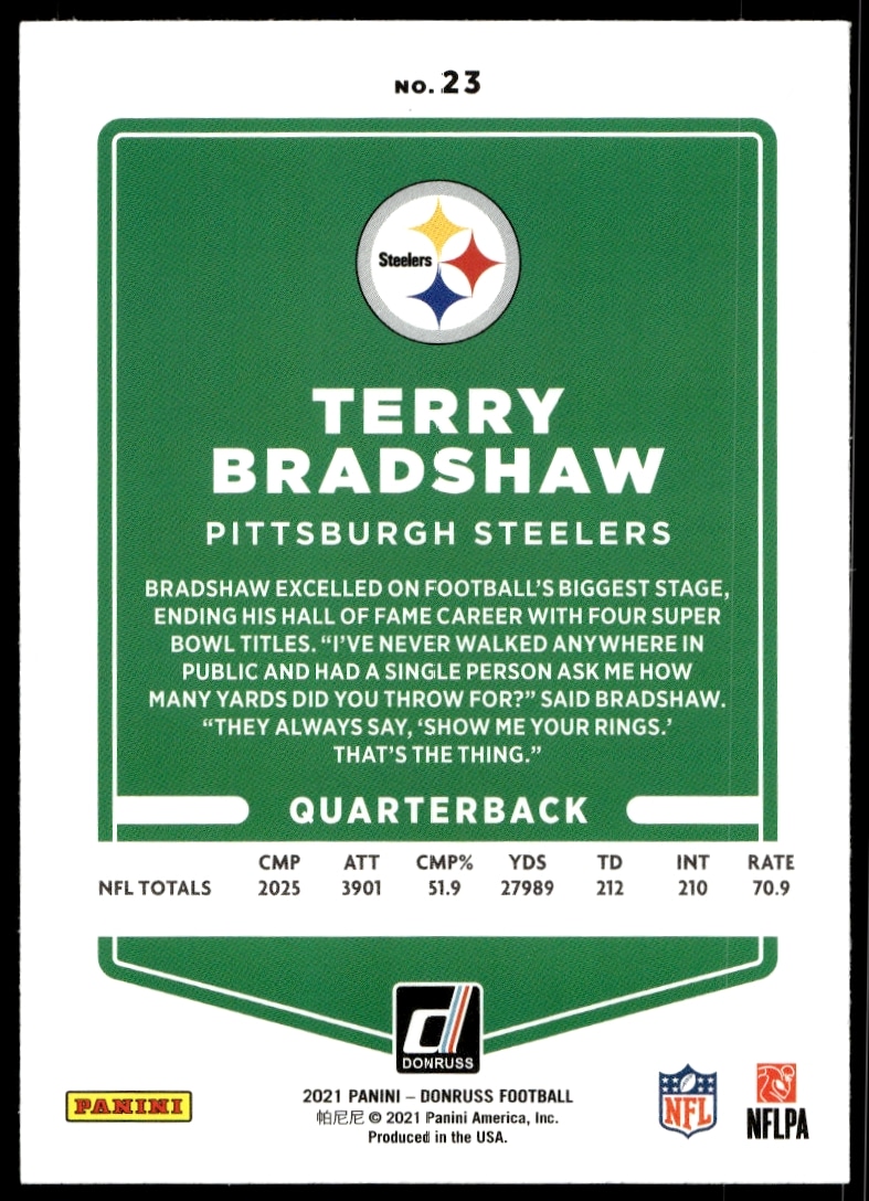 This Football card, from 2021 is part of the Donruss card set. Terry Bradshaw is featured and has a card number of 23.