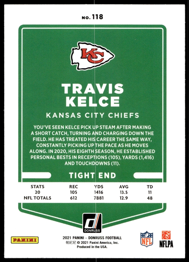 This Football card, from 2021 is part of the Donruss card set. Travis Kelce is featured and has a card number of 118.