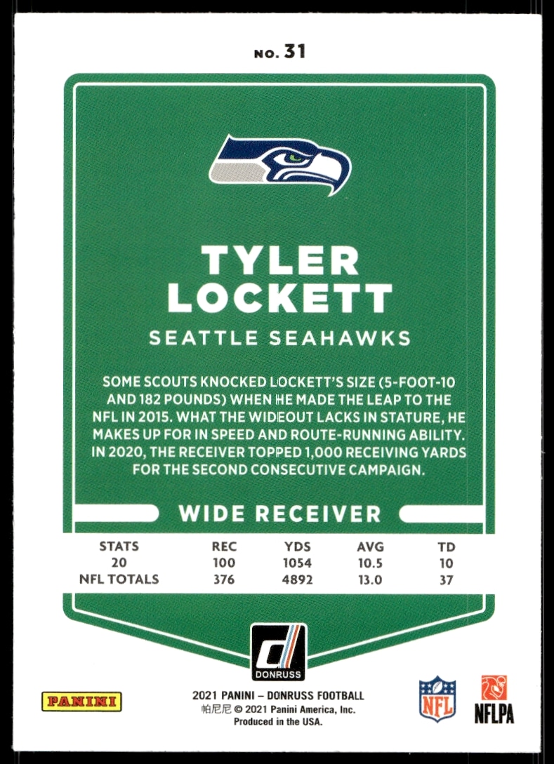 This Football card, from 2021 is part of the Donruss card set. Tyler Lockett is featured and has a card number of 31.