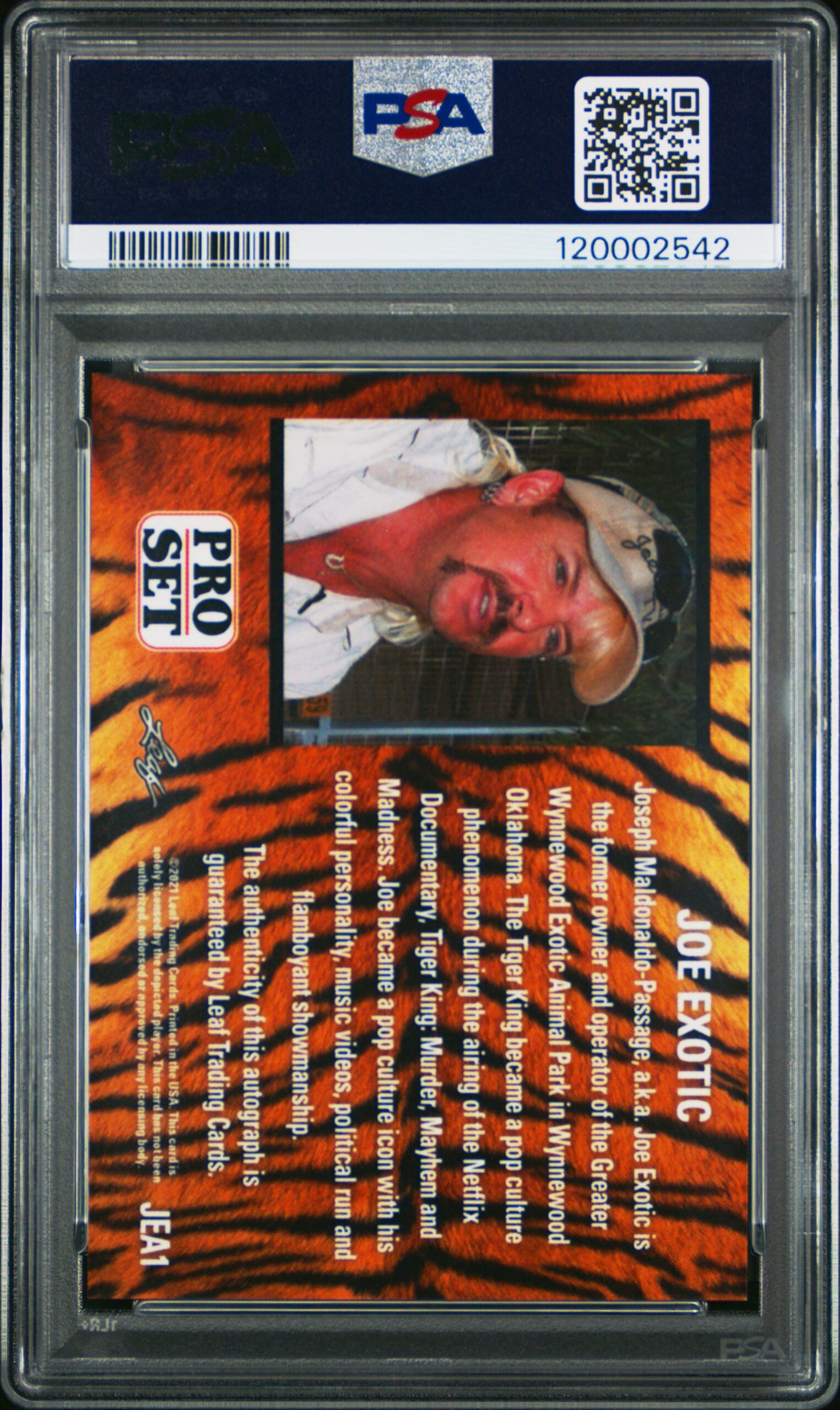 This Entertainment card, from 2021 is part of the Leaf Pro Set card set. Joe Exotic is featured and has a card number of JEA1. It is graded by PSA and has a numeric grade of 10.