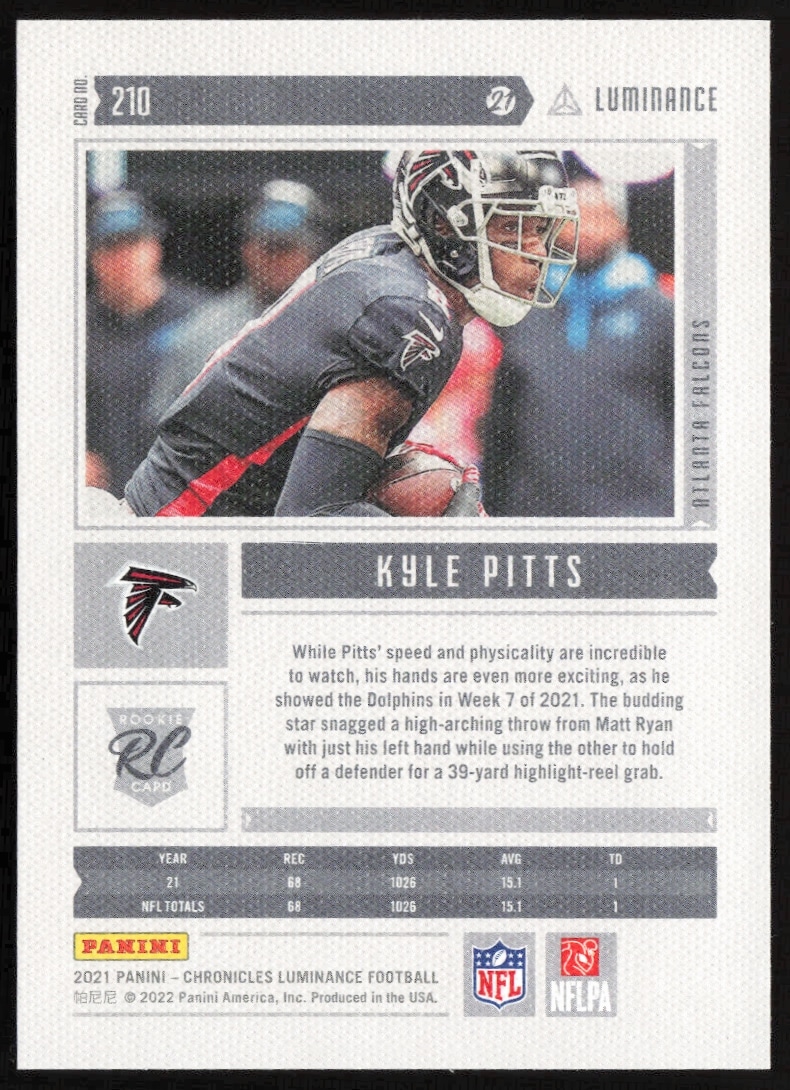 This Football card, from 2021 is part of the Panini Chronicles card set. Kyle Pitts is featured and has a card number of 210.