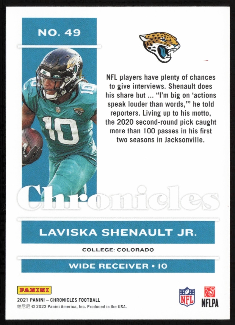 This Football card, from 2021 is part of the Panini Chronicles card set. Laviska Shenault Jr. is featured and has a card number of 49.