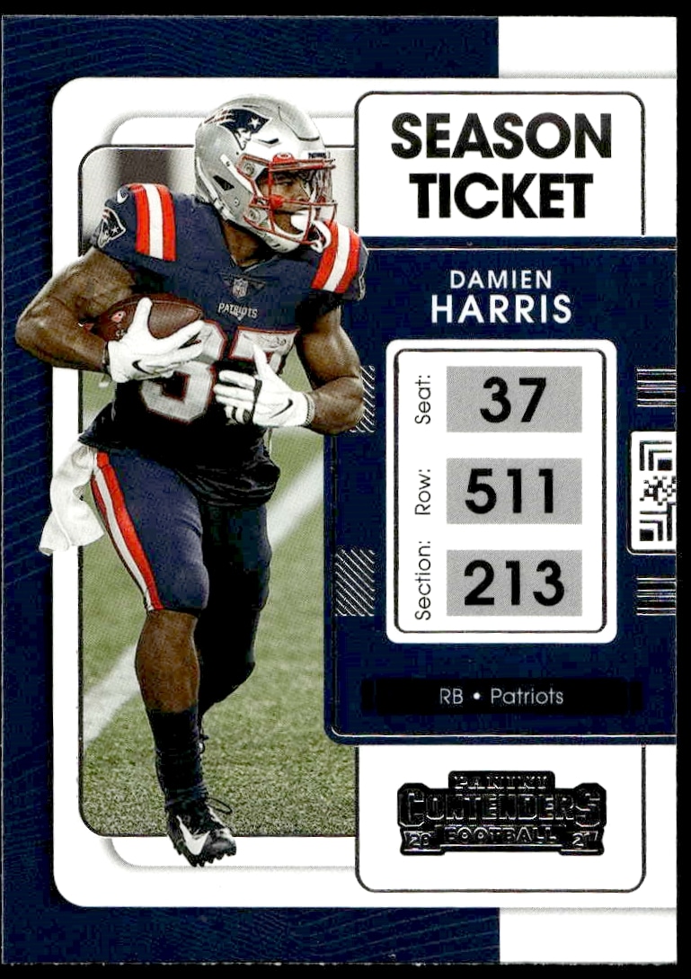 This Football card, from 2021 is part of the Panini Contenders card set. Damien Harris is featured and has a card number of 69.