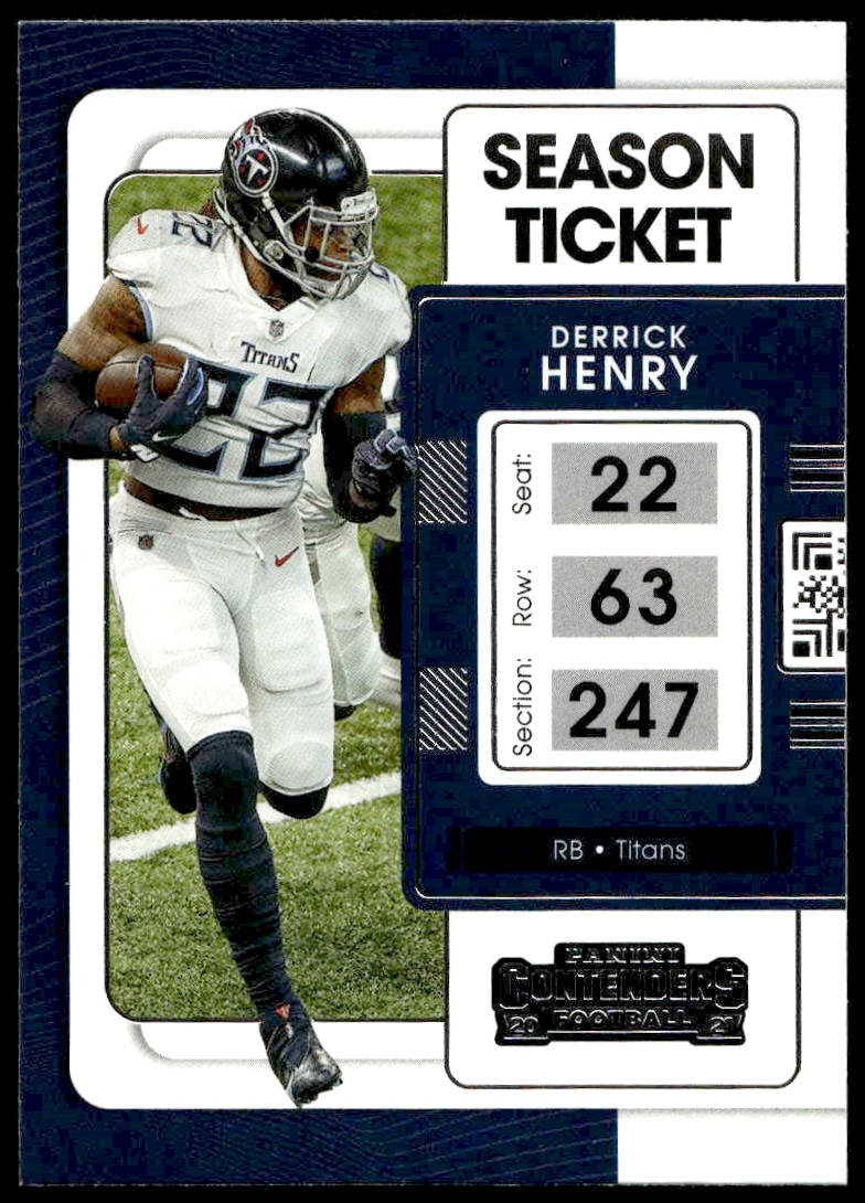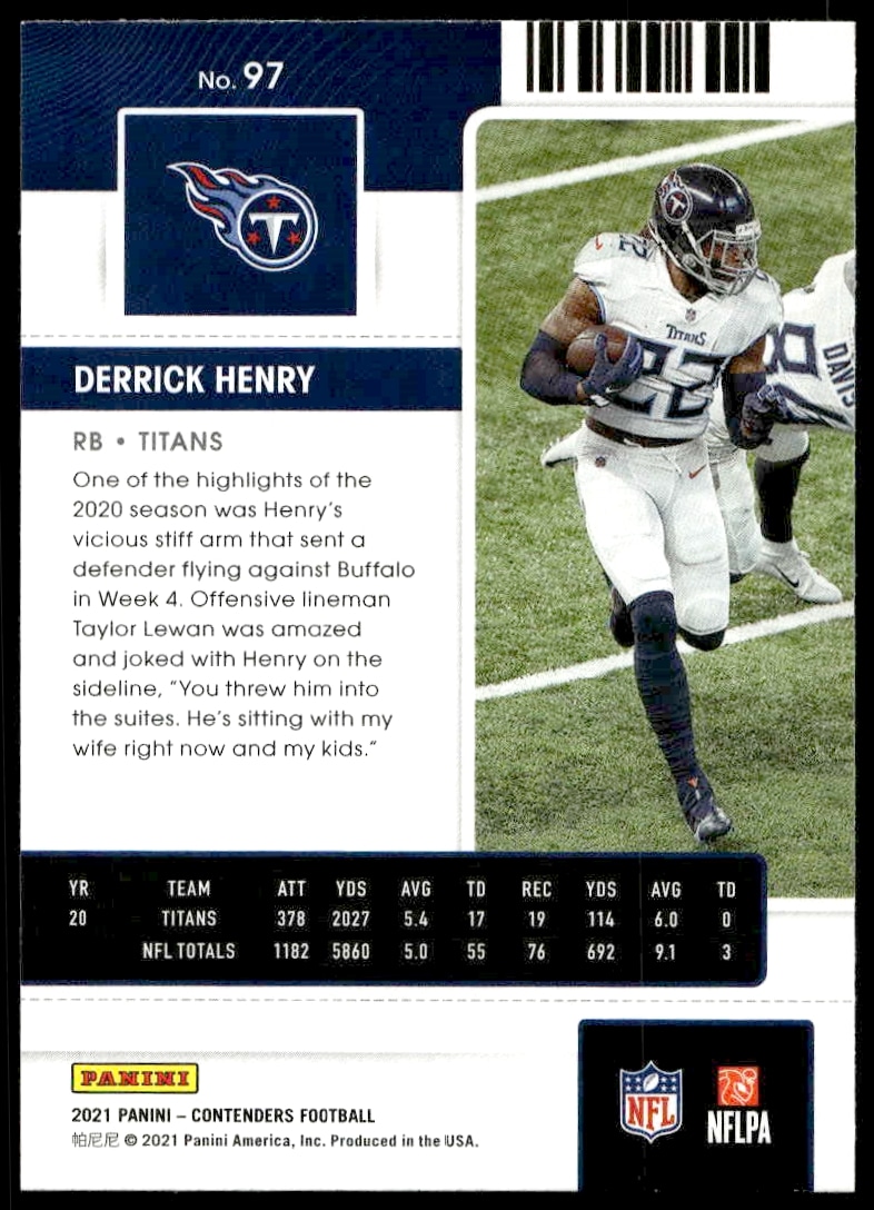 This Football card, from 2021 is part of the Panini Contenders card set. Derrick Henry is featured and has a card number of 97.