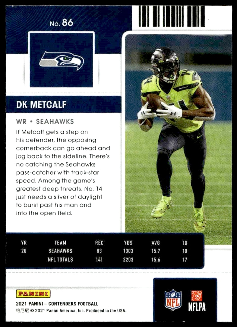 This Football card, from 2021 is part of the Panini Contenders card set. DK Metcalf is featured and has a card number of 86.