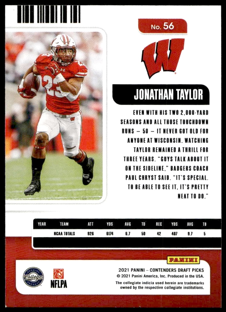 This Football card, from 2021 is part of the Panini Contenders Draft Picks card set. Jonathan Taylor is featured and has a card number of 56.