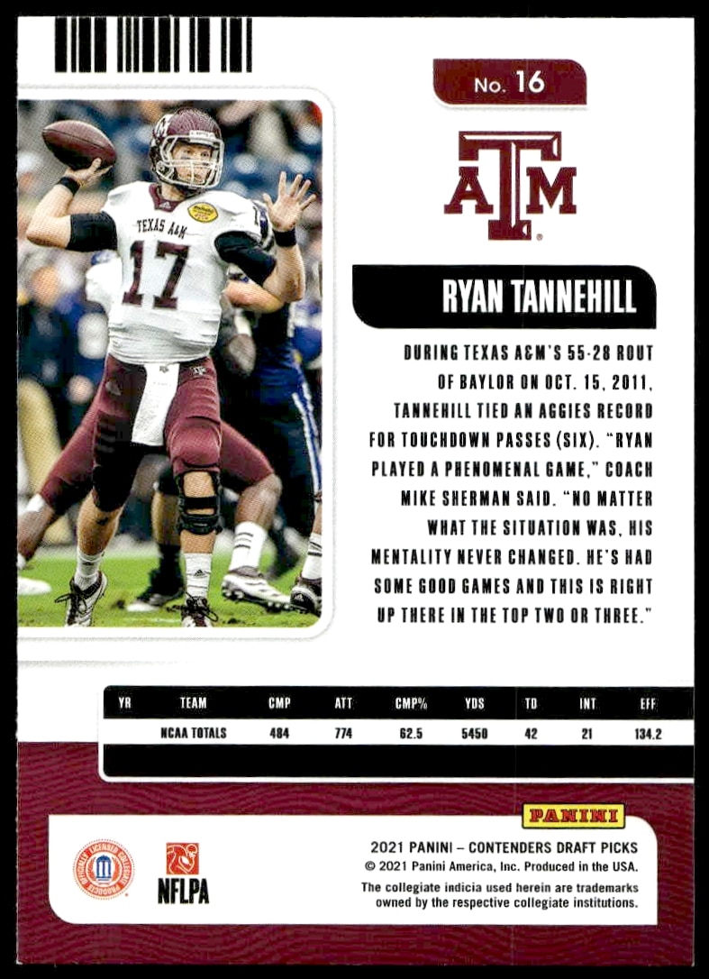 This Football card, from 2021 is part of the Panini Contenders Draft Picks card set. Ryan Tannehill is featured and has a card number of 16.