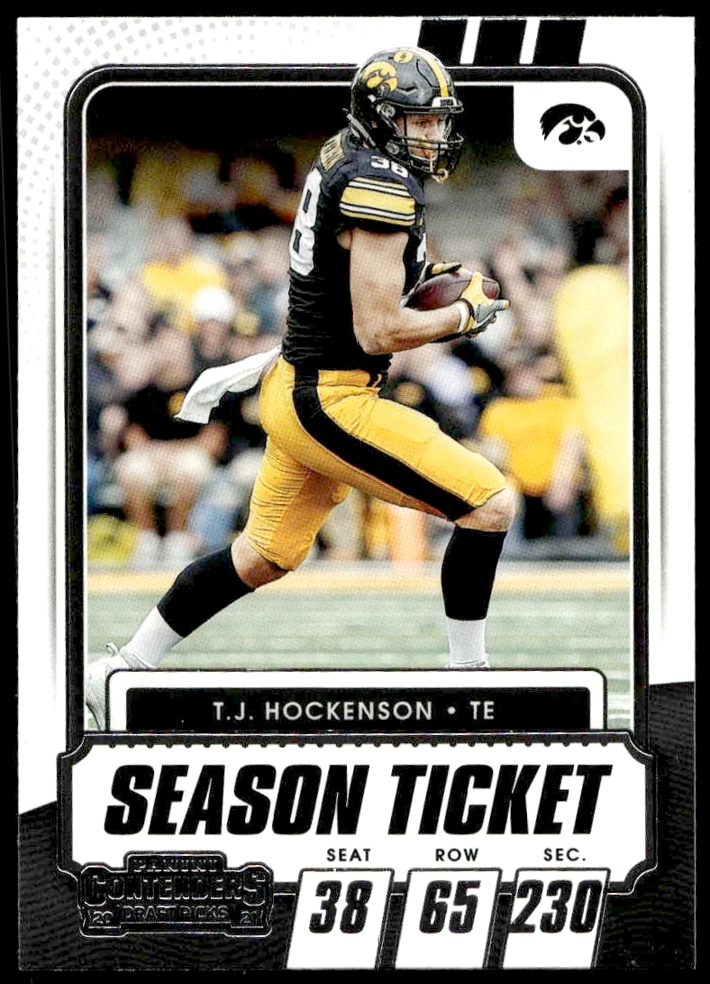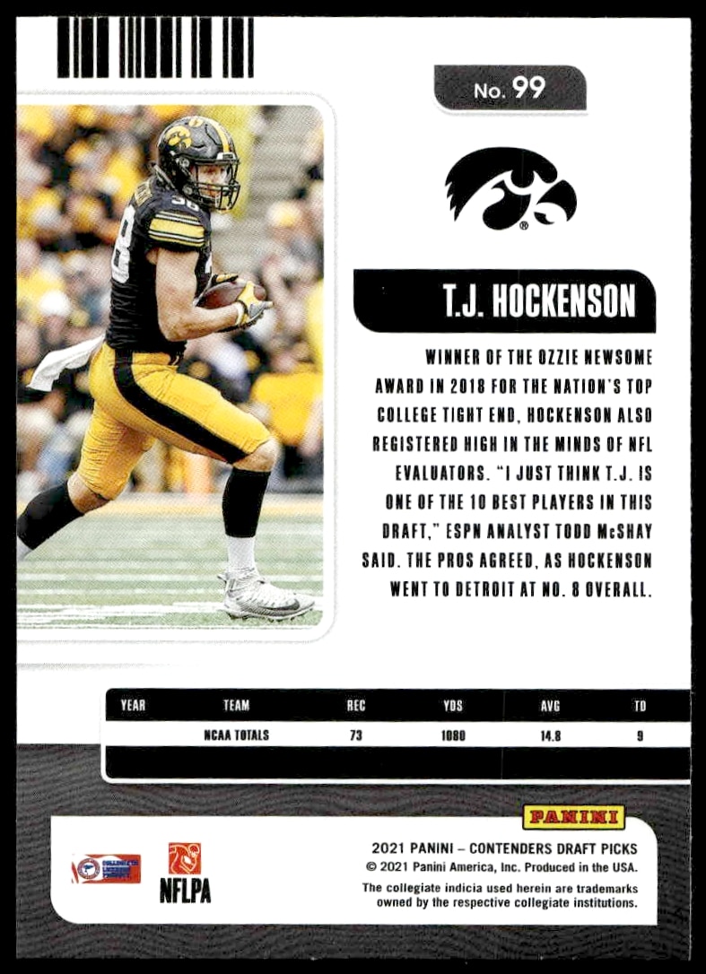 This Football card, from 2021 is part of the Panini Contenders Draft Picks card set. T.J. Hockenson is featured and has a card number of 99.