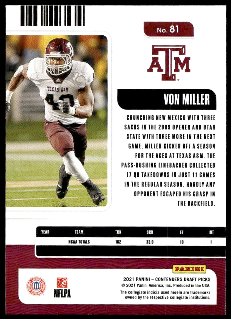 This Football card, from 2021 is part of the Panini Contenders Draft Picks card set. Von Miller is featured and has a card number of 81.