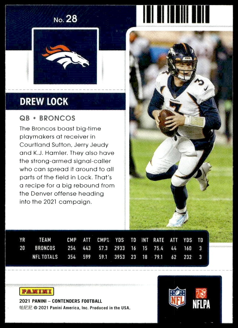 This Football card, from 2021 is part of the Panini Contenders card set. Drew Lock is featured and has a card number of 28.