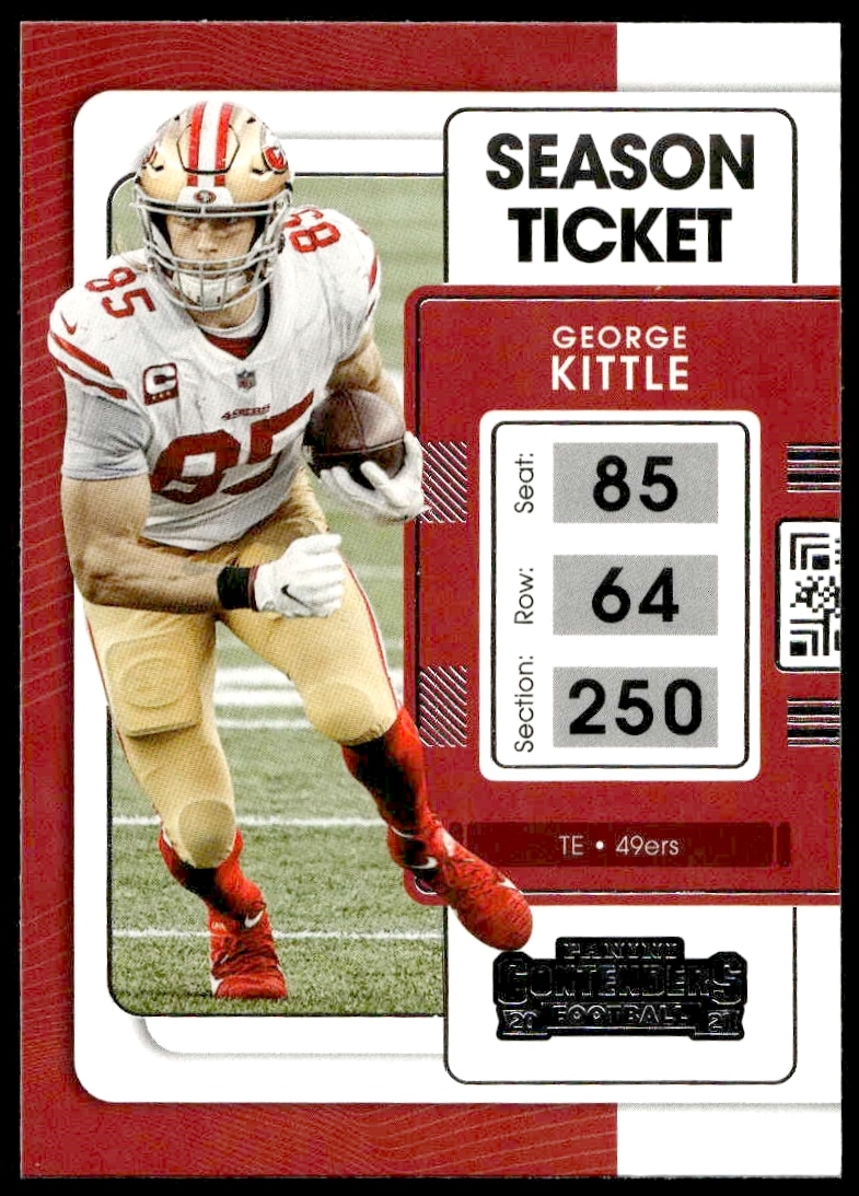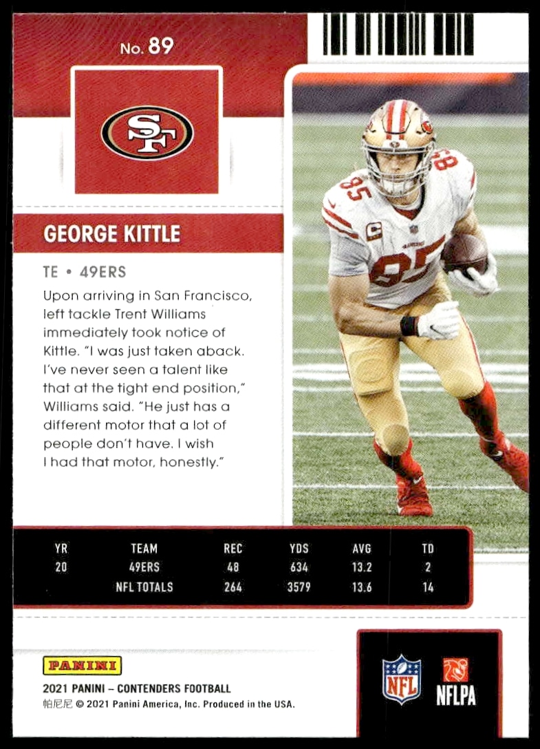 This Football card, from 2021 is part of the Panini Contenders card set. George Kittle is featured and has a card number of 89.