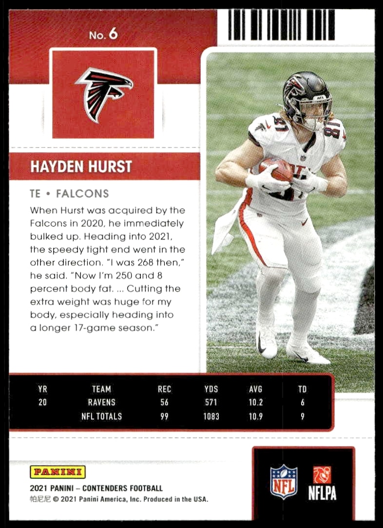 This Football card, from 2021 is part of the Panini Contenders card set. Hayden Hurst is featured and has a card number of 6.
