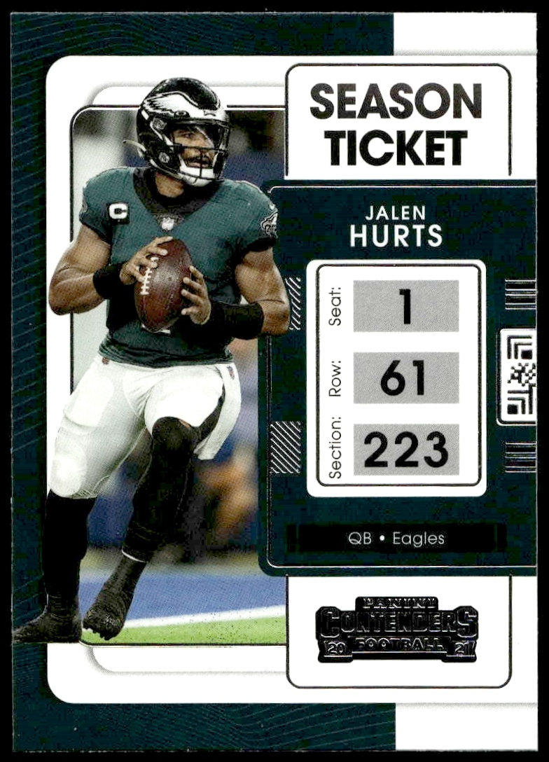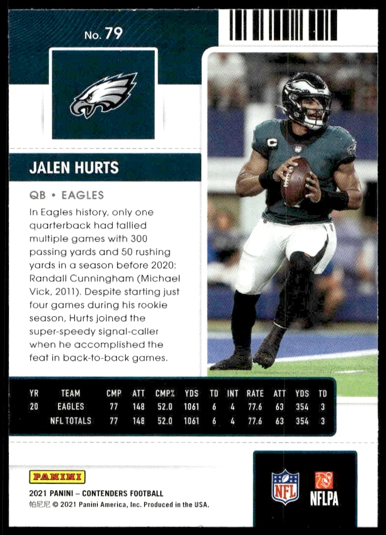 This Football card, from 2021 is part of the Panini Contenders card set. Jalen Hurts is featured and has a card number of 79.