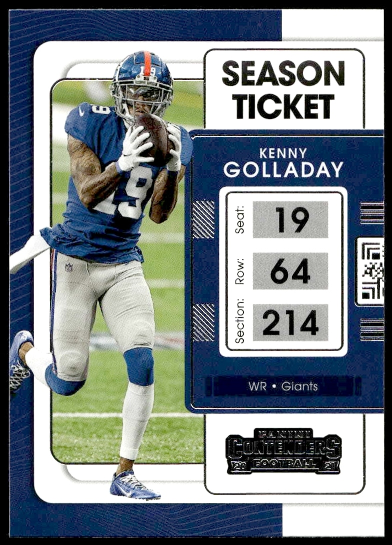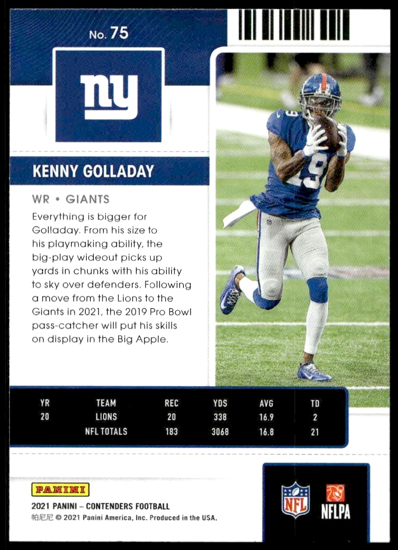 This Football card, from 2021 is part of the Panini Contenders card set. Kenny Golladay is featured and has a card number of 75.