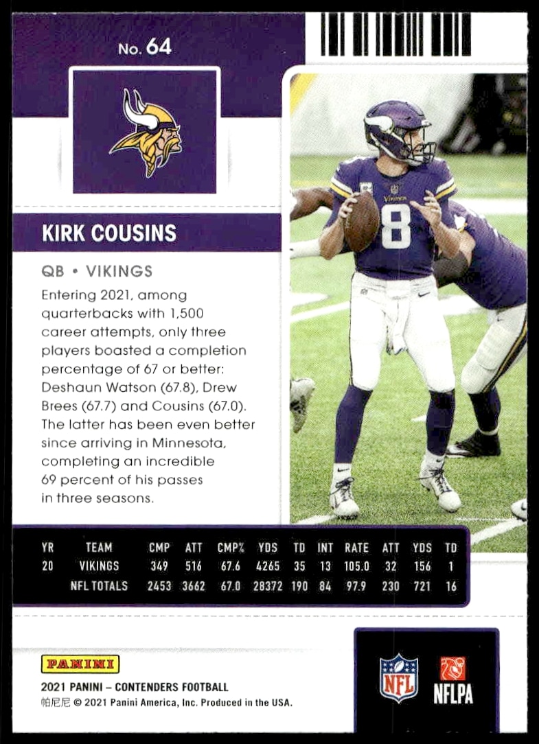 This Football card, from 2021 is part of the Panini Contenders card set. Kirk Cousins is featured and has a card number of 64.