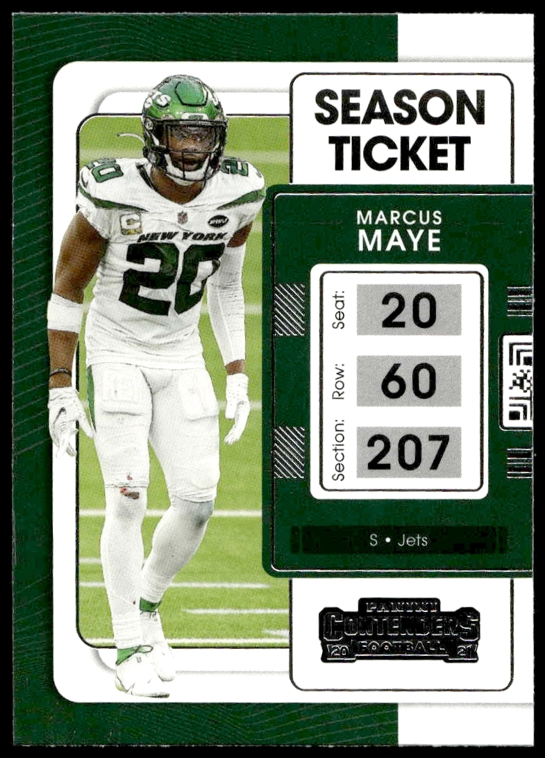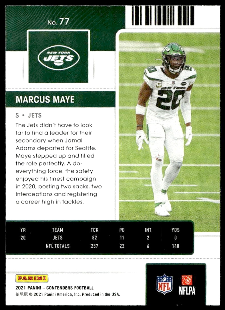 This Football card, from 2021 is part of the Panini Contenders card set. Marcus Maye is featured and has a card number of 77.