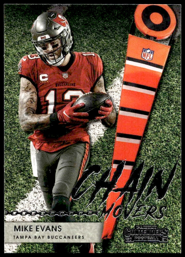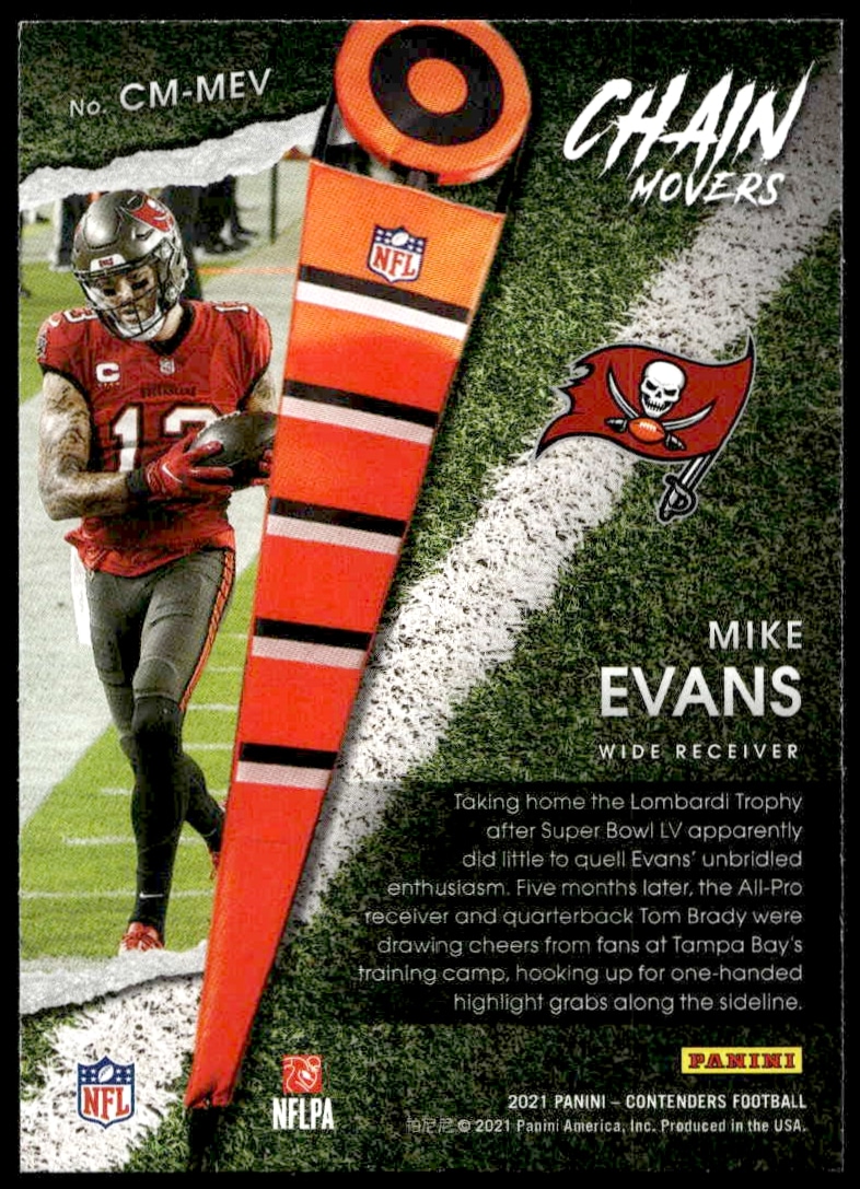 This Football card, from 2021 is part of the Panini Contenders card set. Mike Evans is featured and has a card number of CM-MEV.