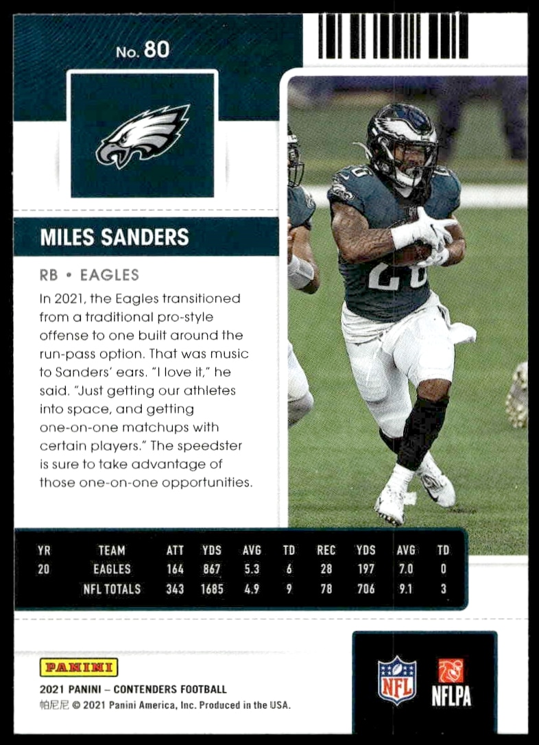 This Football card, from 2021 is part of the Panini Contenders card set. Miles Sanders is featured and has a card number of 80.