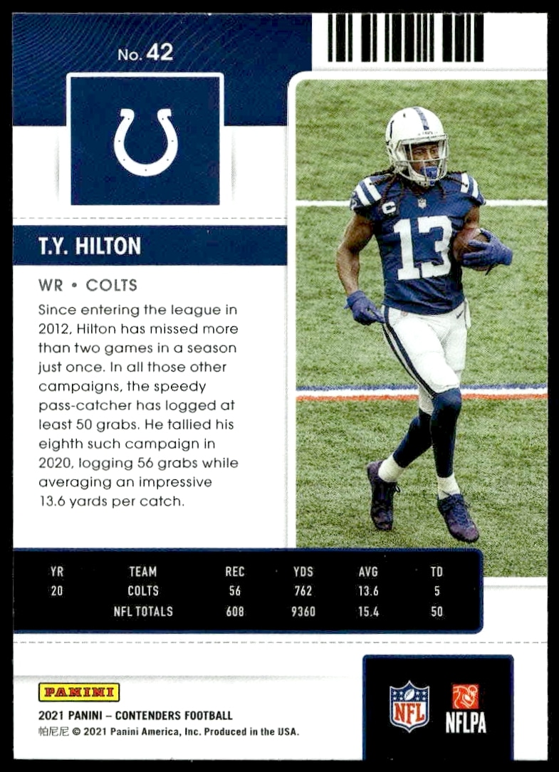 This Football card, from 2021 is part of the Panini Contenders card set. T.Y. Hilton is featured and has a card number of 42.