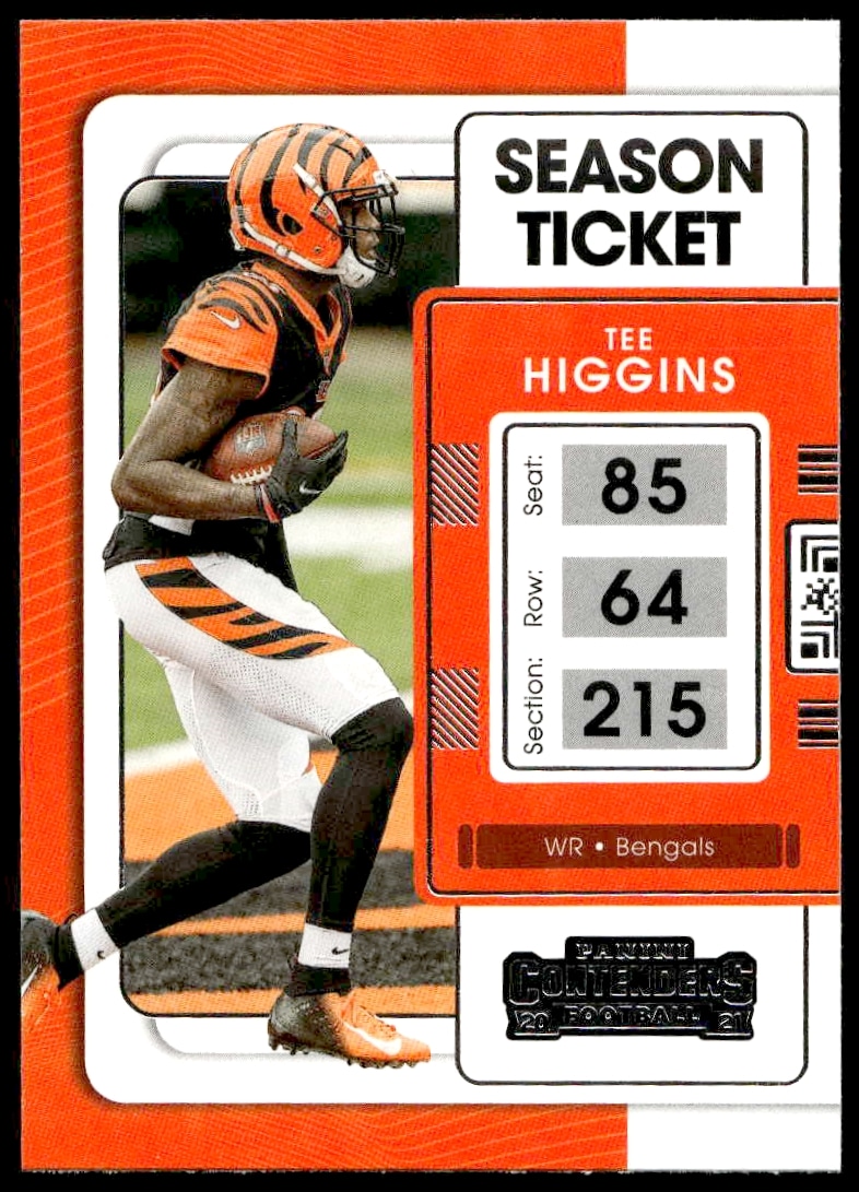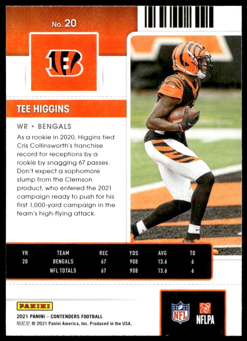 This Football card, from 2021 is part of the Panini Contenders card set. Tee Higgins is featured and has a card number of 20.