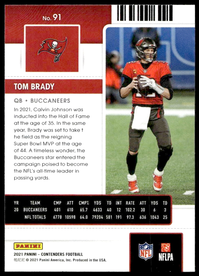 This Football card, from 2021 is part of the Panini Contenders card set. Tom Brady is featured and has a card number of 91.