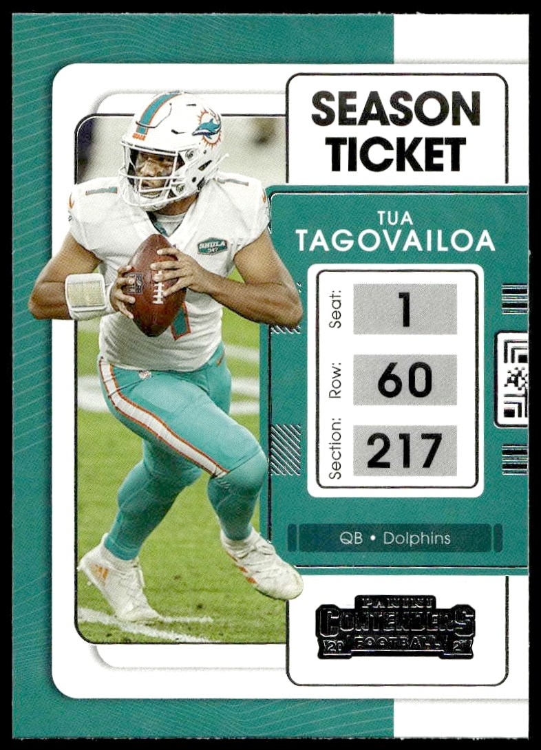 This Football card, from 2021 is part of the Panini Contenders card set. Tua Tagovailoa is featured and has a card number of 60.