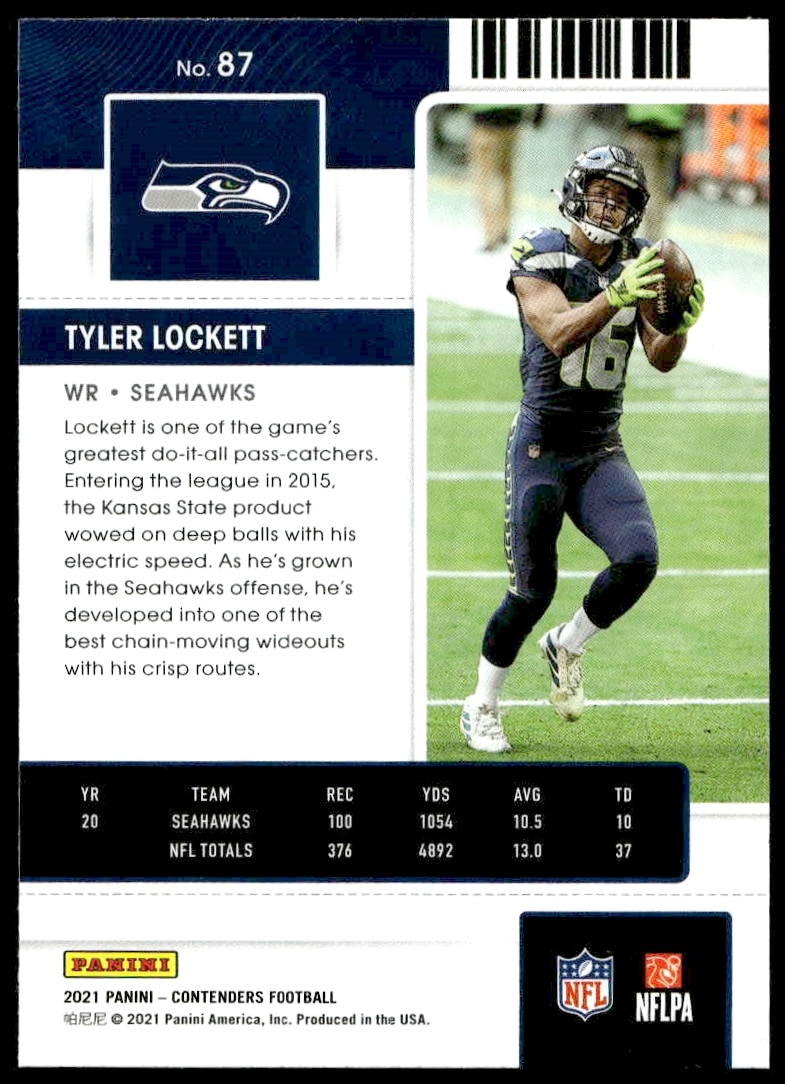 This Football card, from 2021 is part of the Panini Contenders card set. Tyler Lockett is featured and has a card number of 87.