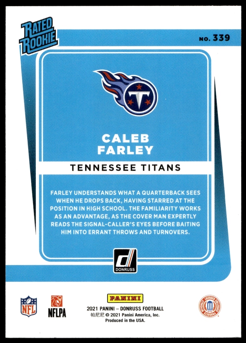 This Football card, from 2021 is part of the Panini Donruss card set. Caleb Farley is featured and has a card number of 339.