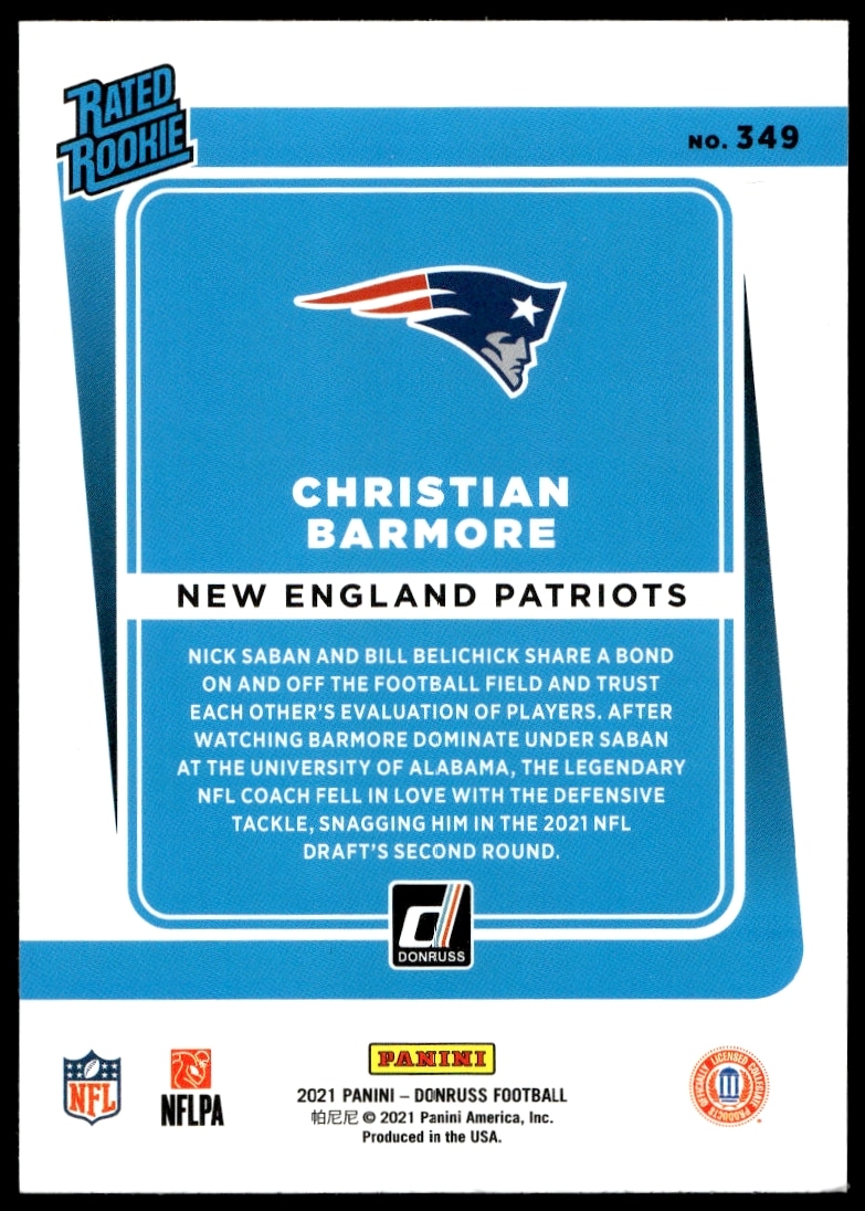 This Football card, from 2021 is part of the Panini Donruss card set. Christian Barmore is featured and has a card number of 349.