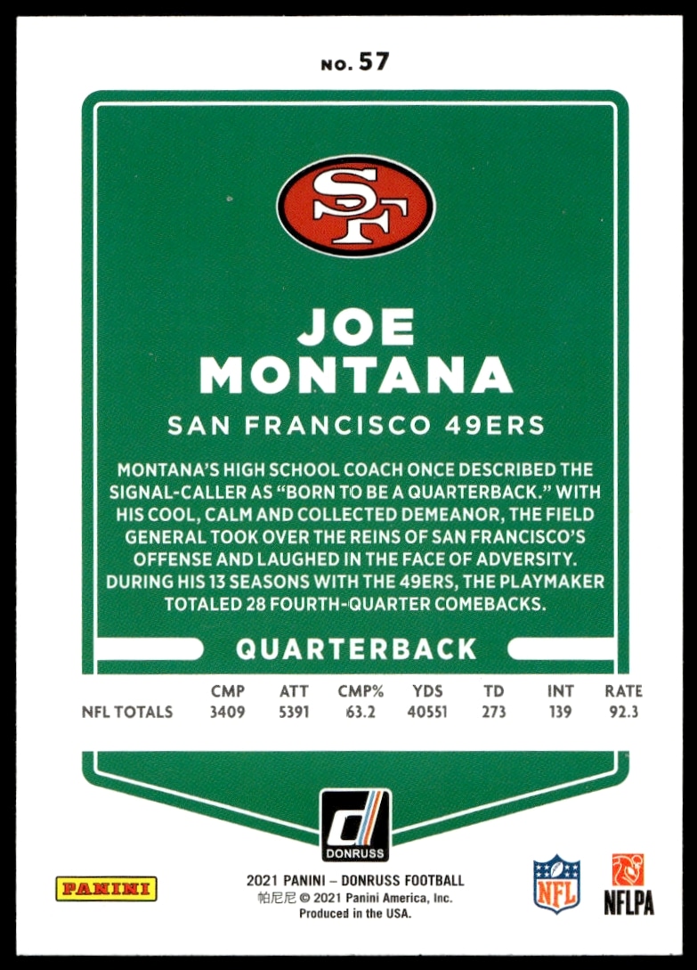 This Football card, from 2021 is part of the Panini Donruss card set. Joe Montana is featured and has a card number of 57.