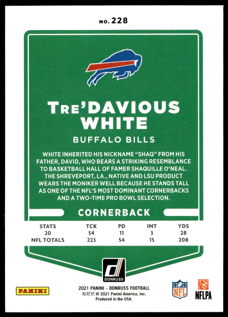 This Football card, from 2021 is part of the Panini Donruss card set. Tre’Davious White is featured and has a card number of 228.