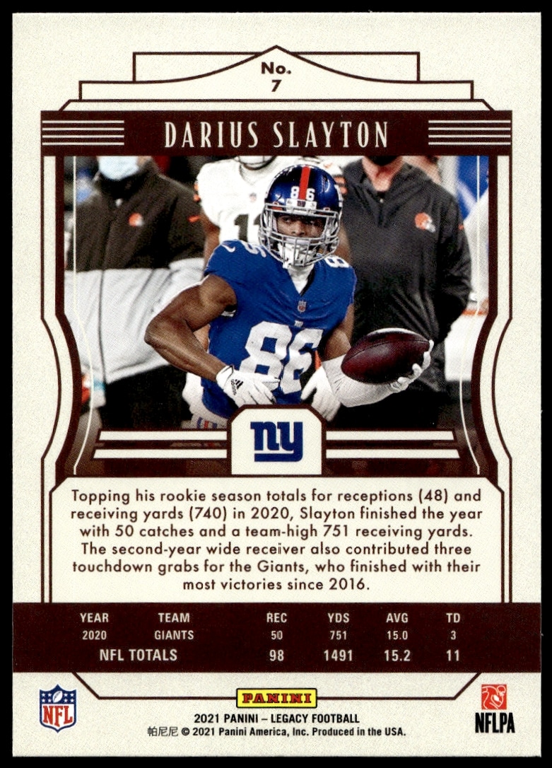 This Football card, from 2021 is part of the Panini Legacy card set. Darius Slayton is featured and has a card number of 7.
