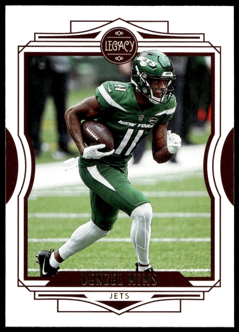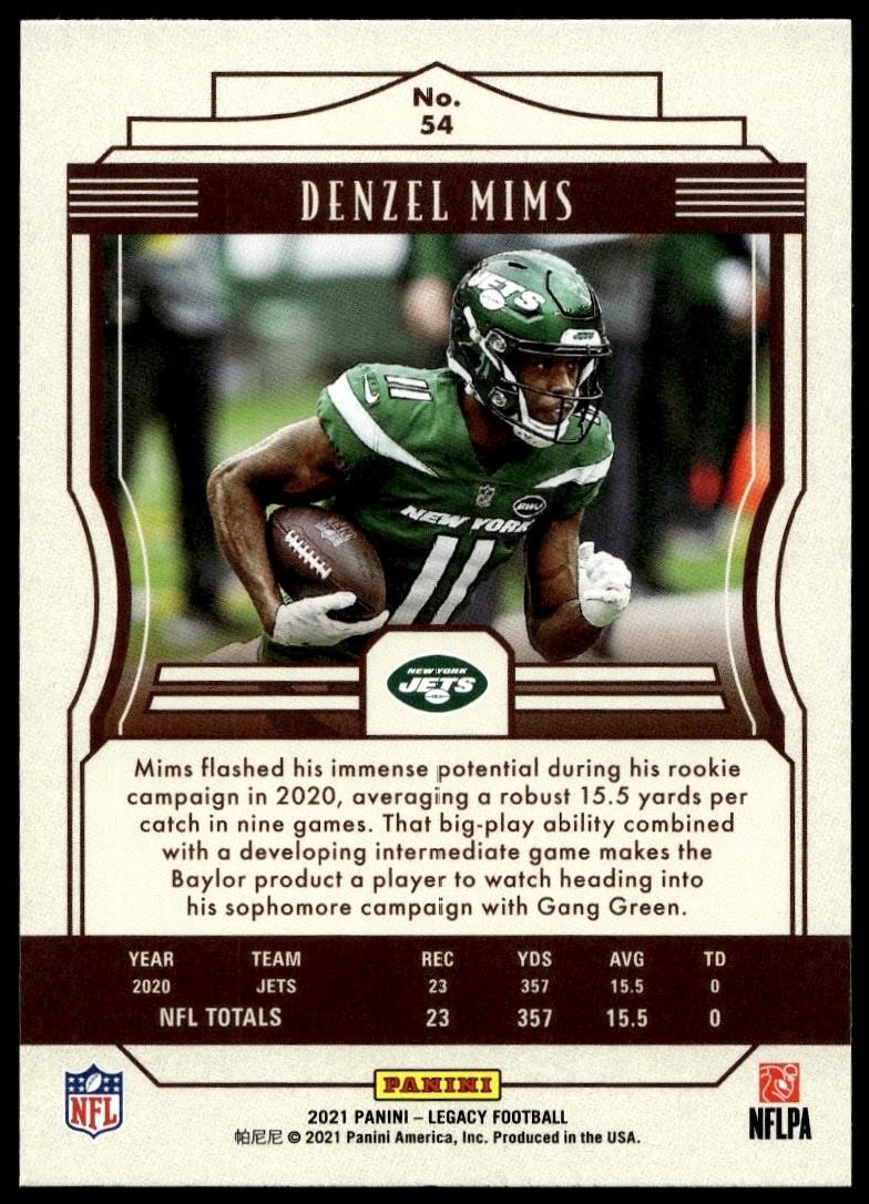 This FootballΒ card, from 2021 is part of the Panini LegacyΒ card set. Denzel Mims is featured and has a card number of 54.