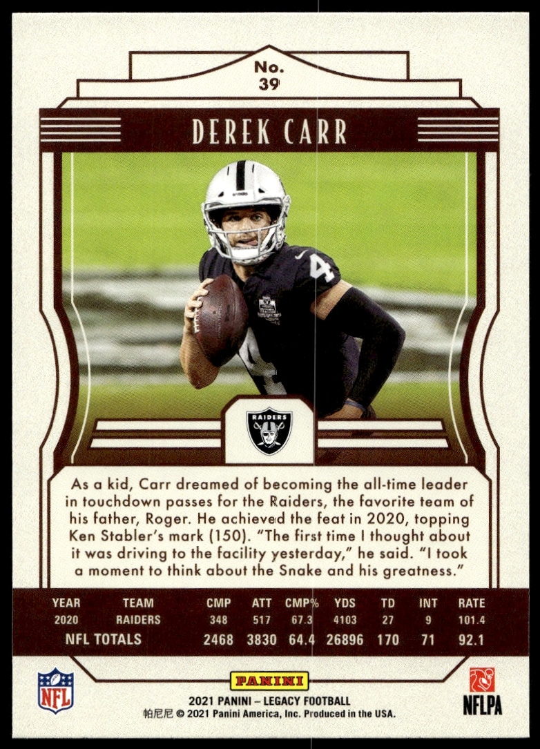 This Football card, from 2021 is part of the Panini Legacy card set. Derek Carr is featured and has a card number of 39.