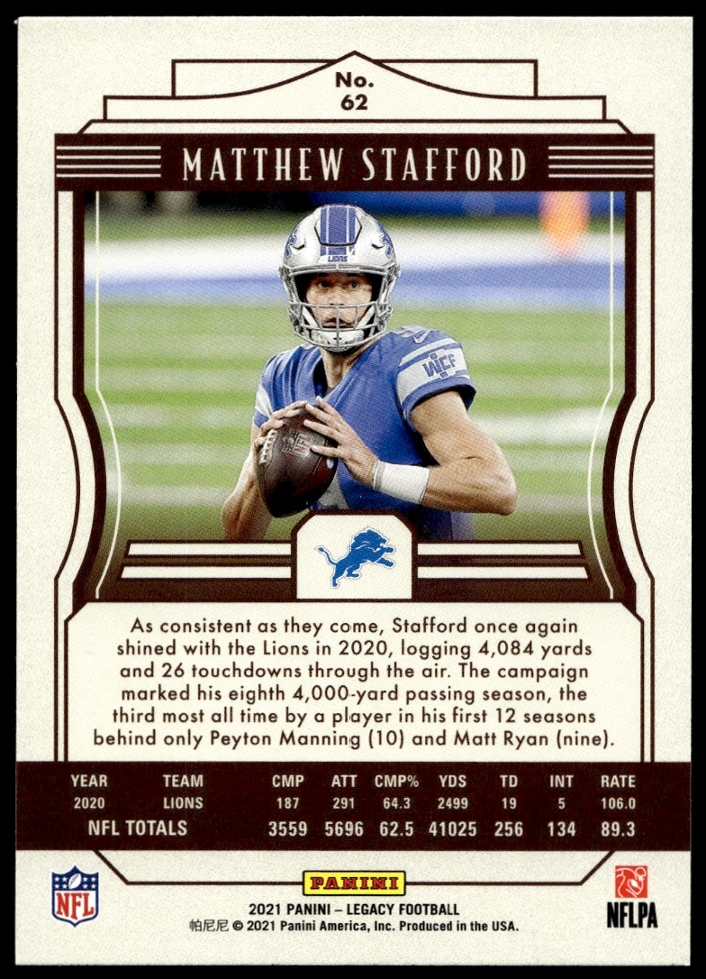 This FootballΒ card, from 2021 is part of the Panini LegacyΒ card set. Matthew Stafford is featured and has a card number of 62.