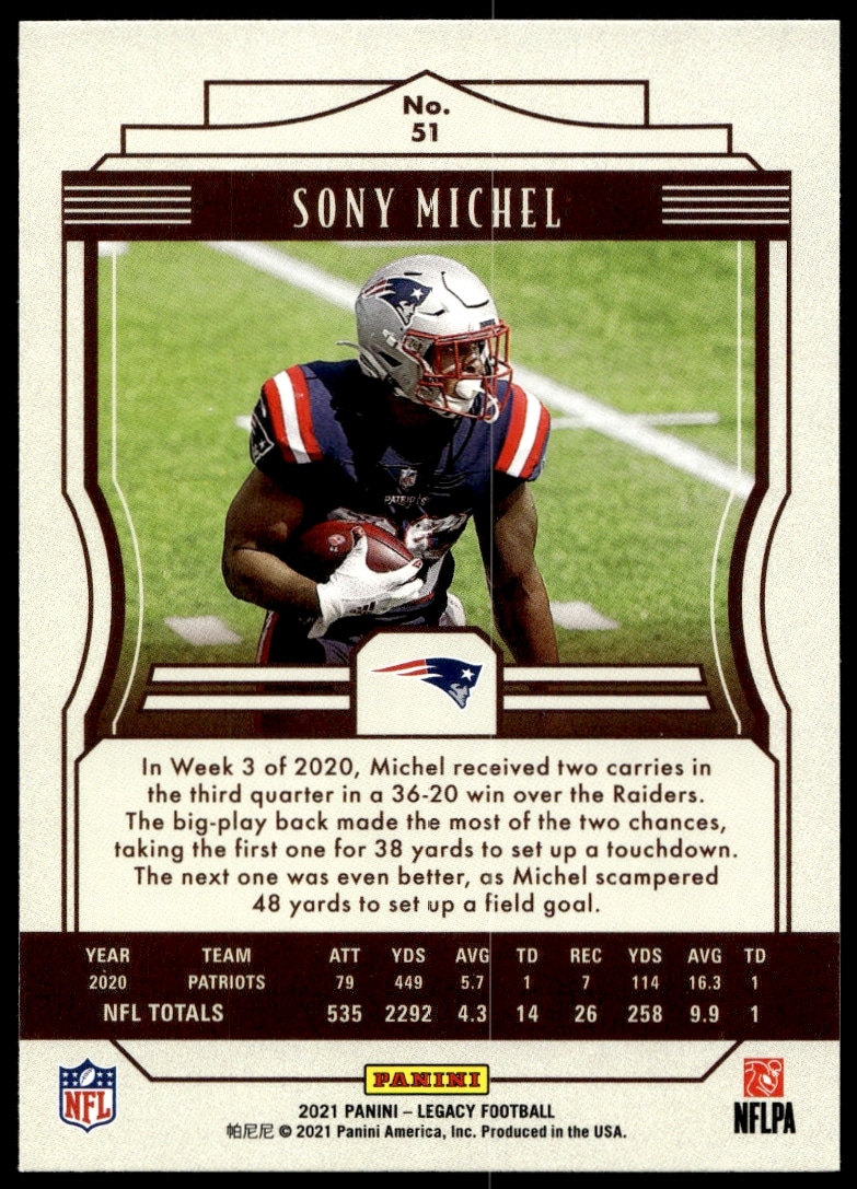 This Football card, from 2021 is part of the Panini Legacy card set. Sony Michel is featured and has a card number of 51.