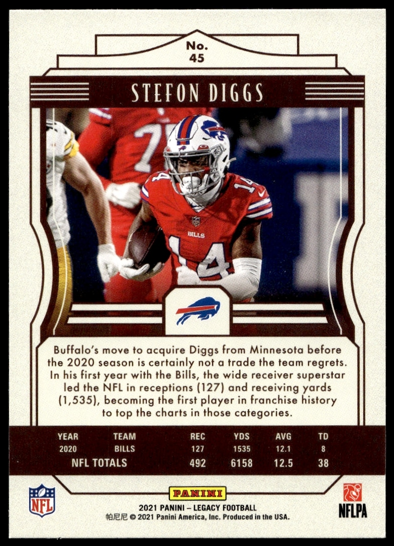 This Football card, from 2021 is part of the Panini Legacy card set. Stefon Diggs is featured and has a card number of 45.