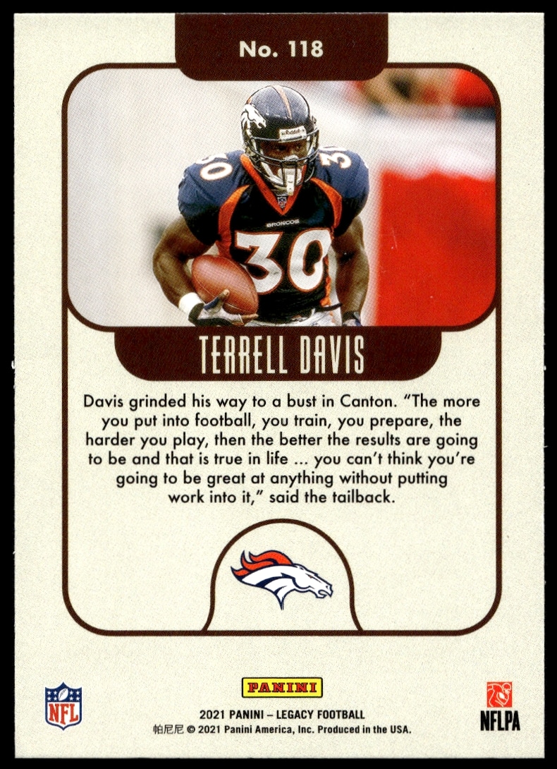 This Football card, from 2021 is part of the Panini Legacy card set. Terrell Davis is featured and has a card number of 118.