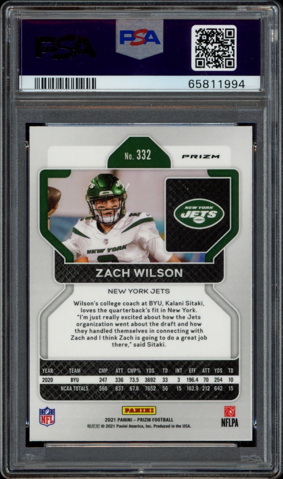 2021 Panini Prizm Zach Wilson Silver Prizm #332 in PSA 9 condition, a must-have collectible for fans and investors alike!