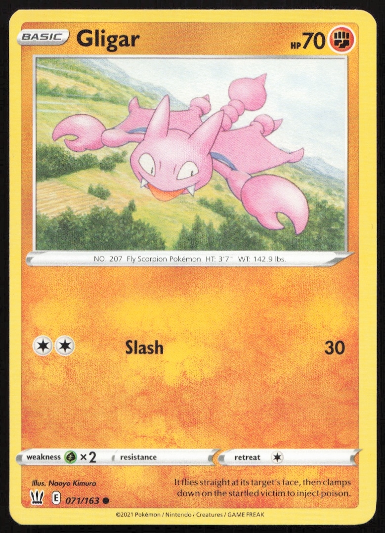 This Pokémon card, from 2021 is part of the Pokémon Sword & Shield – Battle Styles card set. Gligar is featured and has a card number of 071/163.