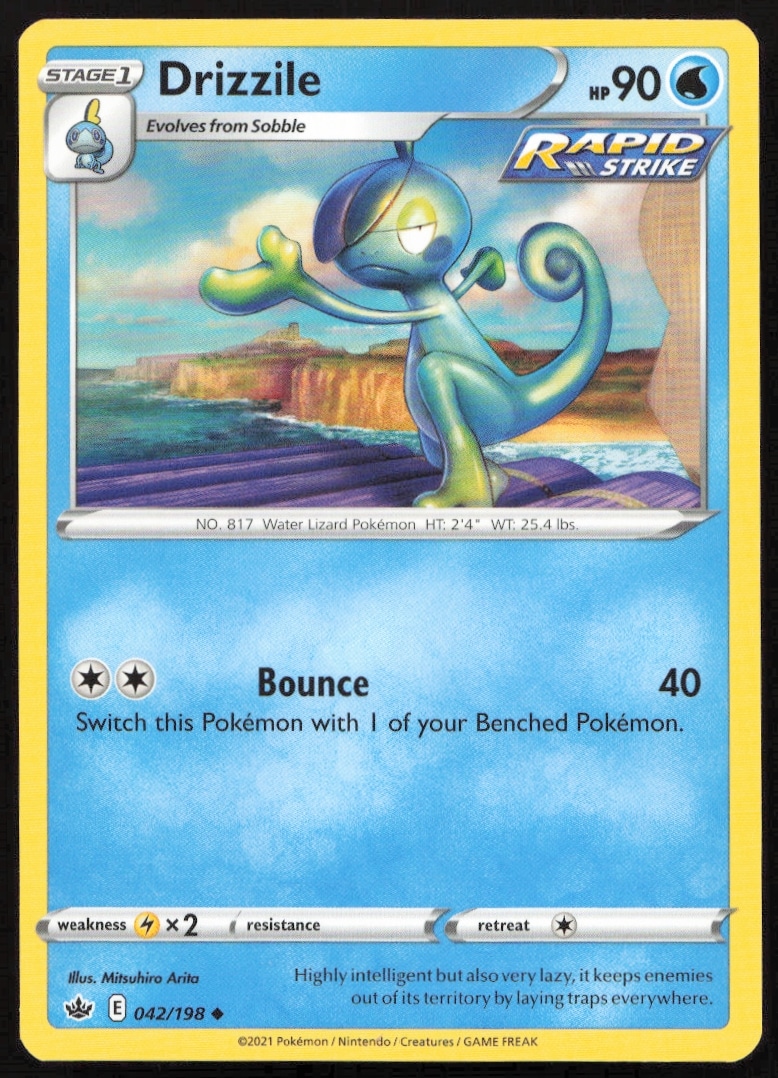 This Pokémon card, from 2021 is part of the Pokémon Sword & Shield – Chilling Reign card set. Drizzile is featured and has a card number of 042/198.