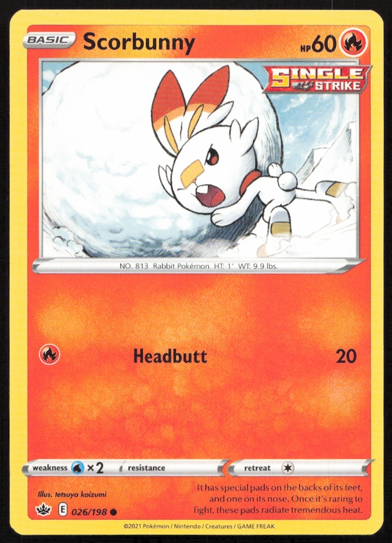 This Pokémon card, from 2021 is part of the Pokémon Sword & Shield – Chilling Reign card set. Scorbunny is featured and has a card number of 026/198.