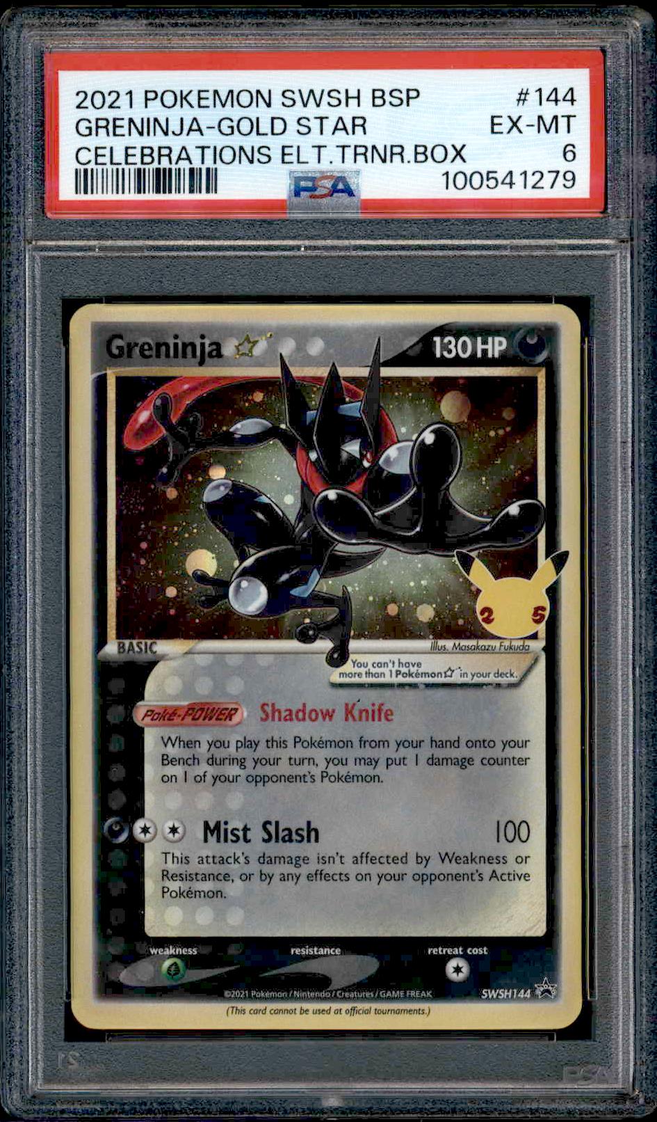 Get the 2021 Greninja Black Star Promo Gold Star #SWSH144, PSA 6 graded. A must-have for collectors and Pokémon fans alike!