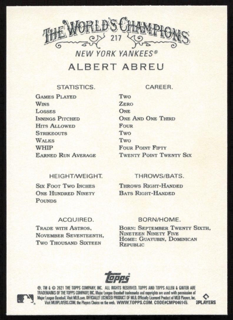 This Baseball card, from 2021 is part of the Topps Allen & Ginter card set. Albert Abreu is featured and has a card number of 217.