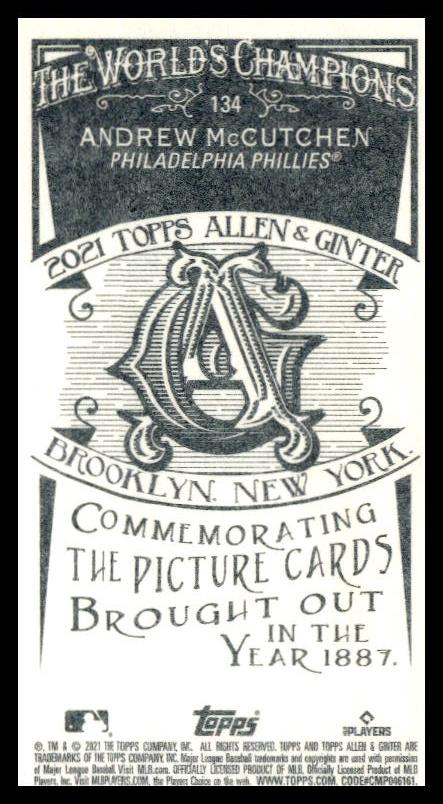 This Baseball card, from 2021 is part of the Topps Allen & Ginter card set. Andrew McCutchen is featured and has a card number of 134.